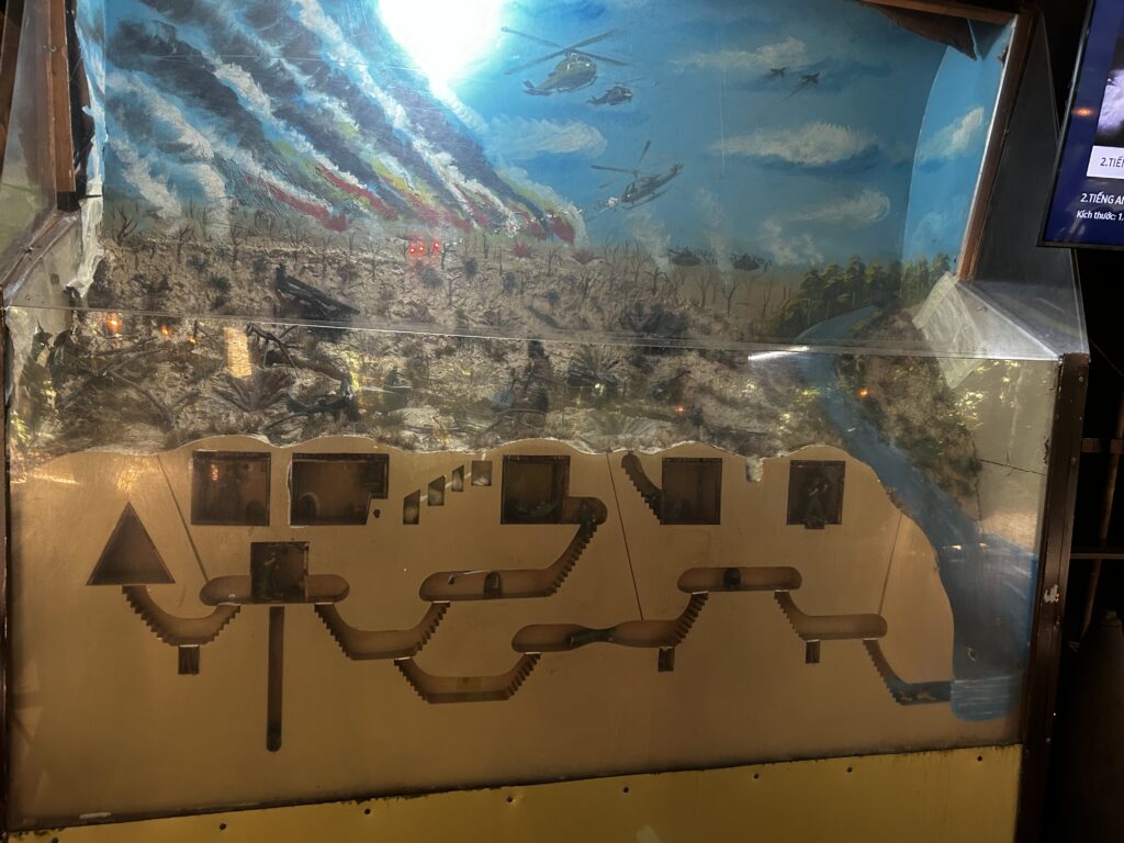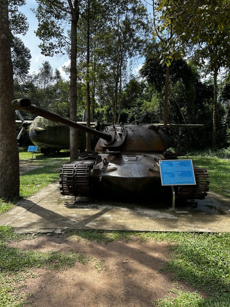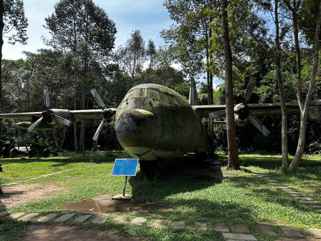 On the way to Cu Chi tunnels, we stopped at a lacquer painting shop managed by the handicapped people affected by Agent Orange a dangerous herbicide mixture used by the US military during the Vietnam War to clear the jungle. Meticulously made artwork using eggshells takes many days for the final product and looks exquisite. We went on further and reached the Cu Chi tunnels. Some aircraft used by the US Military were put on display and a documentary on the tunnels with a small museum. We were allowed to crawl inside the tunnels and experience them. They were made larger to accommodate tourists. But they were still very difficult and many gave up after going through some tunnels. The next few days were like hell due to quadriceps strain thanks to all the crawling inside the tunnel. As soon as the tour ended, it started raining heavily. We were fortunate in that way.